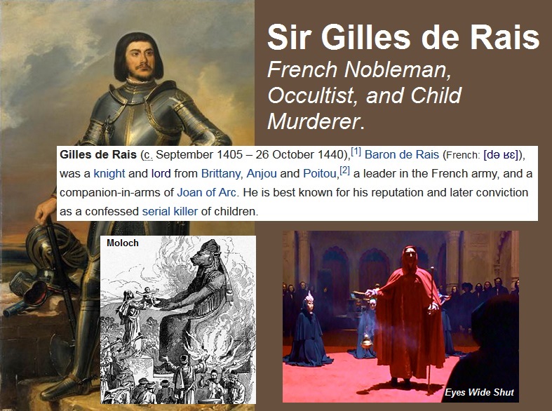 https://archive.4plebs.org/pol/thread/522659686/#q522664118 Although this case and others posted here are German, their origin is linked to France, since Belgium was part of it. >Be Gilles de Rais >French nobleman, esteemed general who fought alongside Joan of Arc >Retires wealthy and respected >Becomes addicted to status, throws lavish parties and events to the point of bankruptcy >Seeks out Italian priest/alchemist who instructs him and his inner circle on how to perform blood rites to curry favor with demonic entities >Uses influence to abduct local peasant children, tortures and sodomizes them to evoke demonic energy. Believes consumption of the blood (or vitae) or a tortured child grants spiritual powers >Caught after dispute with Catholic church causes his local church to be investigated >He and his close associates took the fall for 100s of murders, likely many more elites escaped punishment >Be Gilles de Rais >French nobleman, esteemed general who fought alongside Joan of Arc >Retires wealthy and respected >Becomes addicted to status, throws lavish parties and events to the point of bankruptcy >Seeks out Italian priest/alchemist who instructs him and his inner circle on how to perform blood rites to curry favor with demonic entities >Uses influence to abduct local peasant children, tortures and sodomizes them to evoke demonic energy. Believes consumption of the blood (or vitae) or a tortured child grants spiritual powers >Caught after dispute with Catholic church causes his local church to be investigated >He and his close associates took the fall for 100s of murders, likely many more elites escaped punishment >In his testimony, Gilles De Rais claimed that he had taken an example from the rulers of ancient Rome, about whose barbaric perversions he had read in illustrated manuscripts stored in the family library. “I found a book in Latin about the life and customs of the Roman emperors, written by the historian Suetonius (Suetonius),” said Gilles de Rais, “This book contained beautiful drawings depicting the behavior of these pagan emperors, and I was able to read the exciting the story of how Tiberius, Caracalla and other Caesars amused themselves with the children and found their only pleasure, tormenting them. I decided to be like the emperors mentioned and that evening I began to do the same thing as they..." https://fr.wikipedia.org/wiki/Abus_sexuel_ritualisé_sataniste